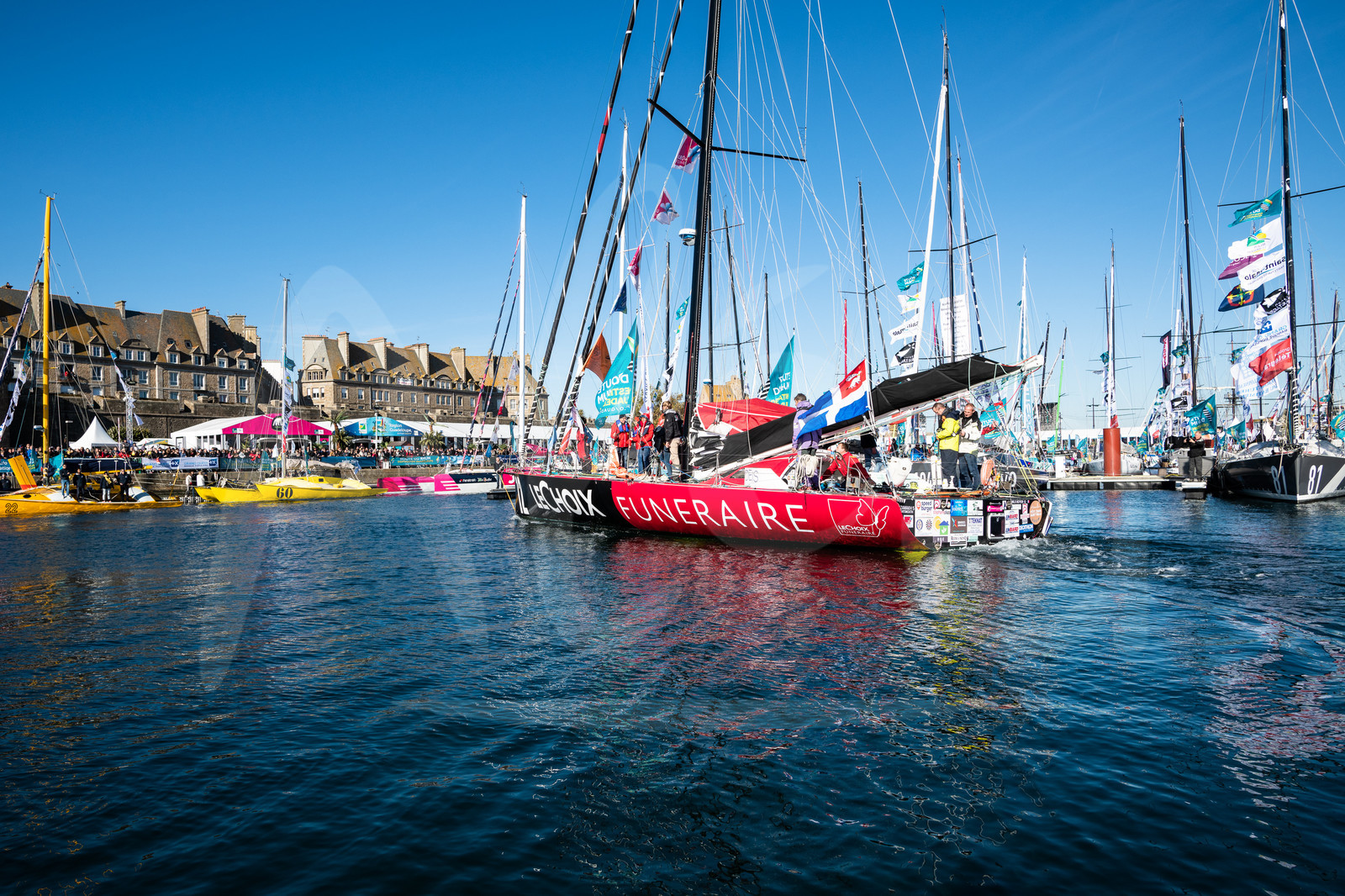 | Description | Ambiance of Rhum Mono Le Choix Funeraire, skipper Nils Boyer, leaving pontoon during the pre-start of the Route du Rhum 2018, on November 3rd, 2018 in St-Malo, north Brittany, France - Photo Jean-Louis Carli / Alea |