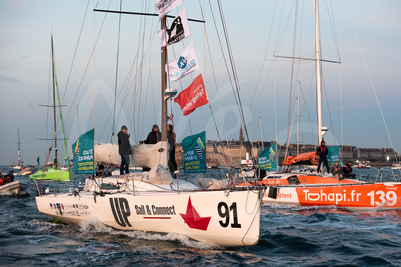 | Description | General view while the class 40 are leaving pontoons to pass a lock towards moorings, they will spend the night before the start of the Route du Rhum 2018, on November 3rd, 2018 in St-Malo, north Brittany, France - Photo Jean-Louis Carli / Alea |
