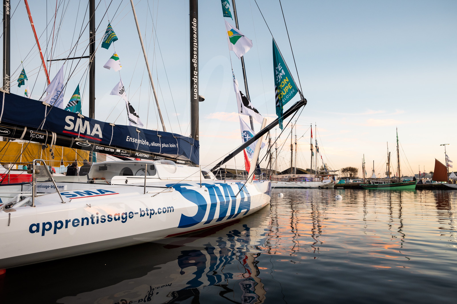 | Description | General view of imoca SMA at dusk during the pre-start of the Route du Rhum 2018, on November 1st, 2018 in St-Malo, north Brittany, France - Photo Jean-Louis Carli / Alea |