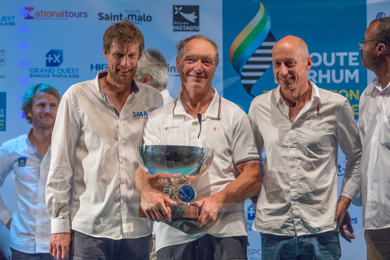 | Description | Prize ceremony and podium for winners in category IMOCA, Ultime and Multi50, from left to right, Paul Meilhat, skipper SMA, Francis Joyon, skipper IDEC Sport, Armel Tripon, skipper Reaute Chocolat, after arrival of the Route du Rhum 2018, on November 17th, 2018 in Pointe-a-Pitre, Guadeloupe, France - Photo Jean-Marie Liot / Alea |