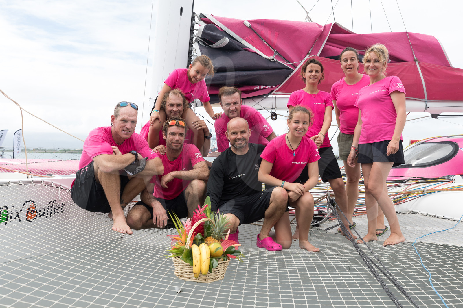 | Description | Team of 2nd place in category Multi50 for Erwan Leroux, skipper Fenetrea - Mix Buffet, during arrival of the Route du Rhum 2018, on November 16th, 2018 in Pointe-a-Pitre, Guadeloupe, France - Photo Jean-Marie Liot / Alea |