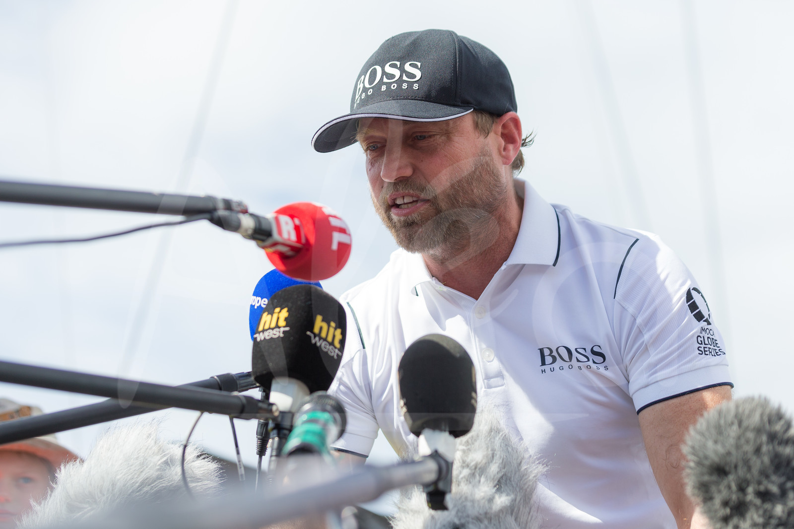 | Description | Media with Hugo Boss, skipper Alex Thomson, 1st arrived but had a 24 hours penalty for having used his engine after he grounded on rocks in North Guadeloupe, took 3rd place after penalty, during arrival of the Route du Rhum 2018, on November 16th, 2018 in Pointe-a-Pitre, Guadeloupe, France - Photo Jean-Marie Liot / Alea |
