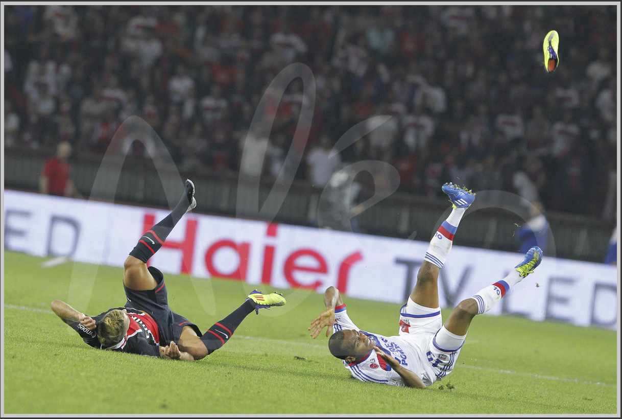 | Description | Illustration de la chute de 2 joueurs de football avec perte d'une chaussure en vol - Photo Stéphane Allaman / Alea |