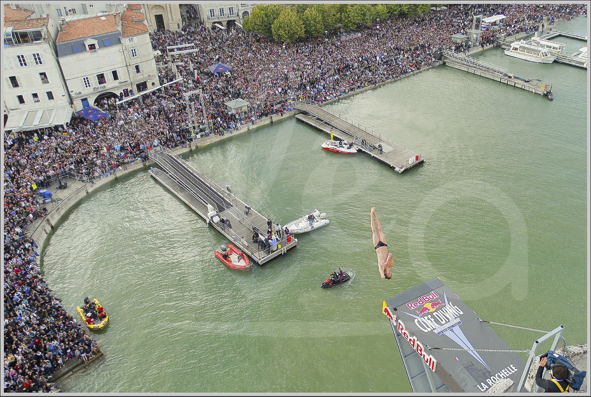 | Description | Illustration d'une figure acrobatique lors d'un plongeon des Red Bull Cliff Diving à La Rochelle, depuis la Tour Saint Nicolas, devant un public nombreux - Photo Stéphane Allaman / Alea |