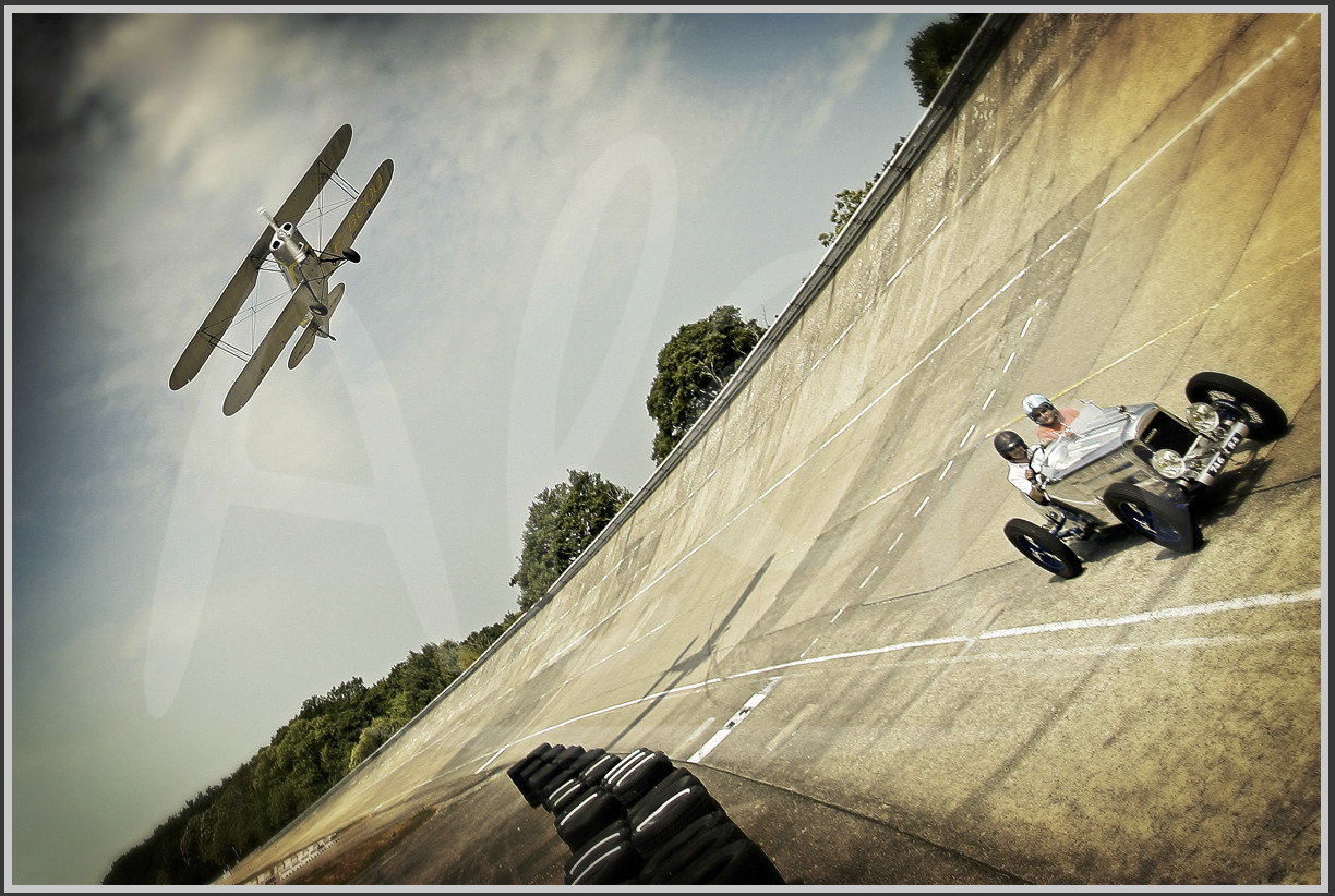 | Description | Illustration sur le circuit de Linas Montlhéry d'une vielle voiture survolée d'un vieux biplan, dans le virage concave - Photo Stéphane Allaman / Alea |