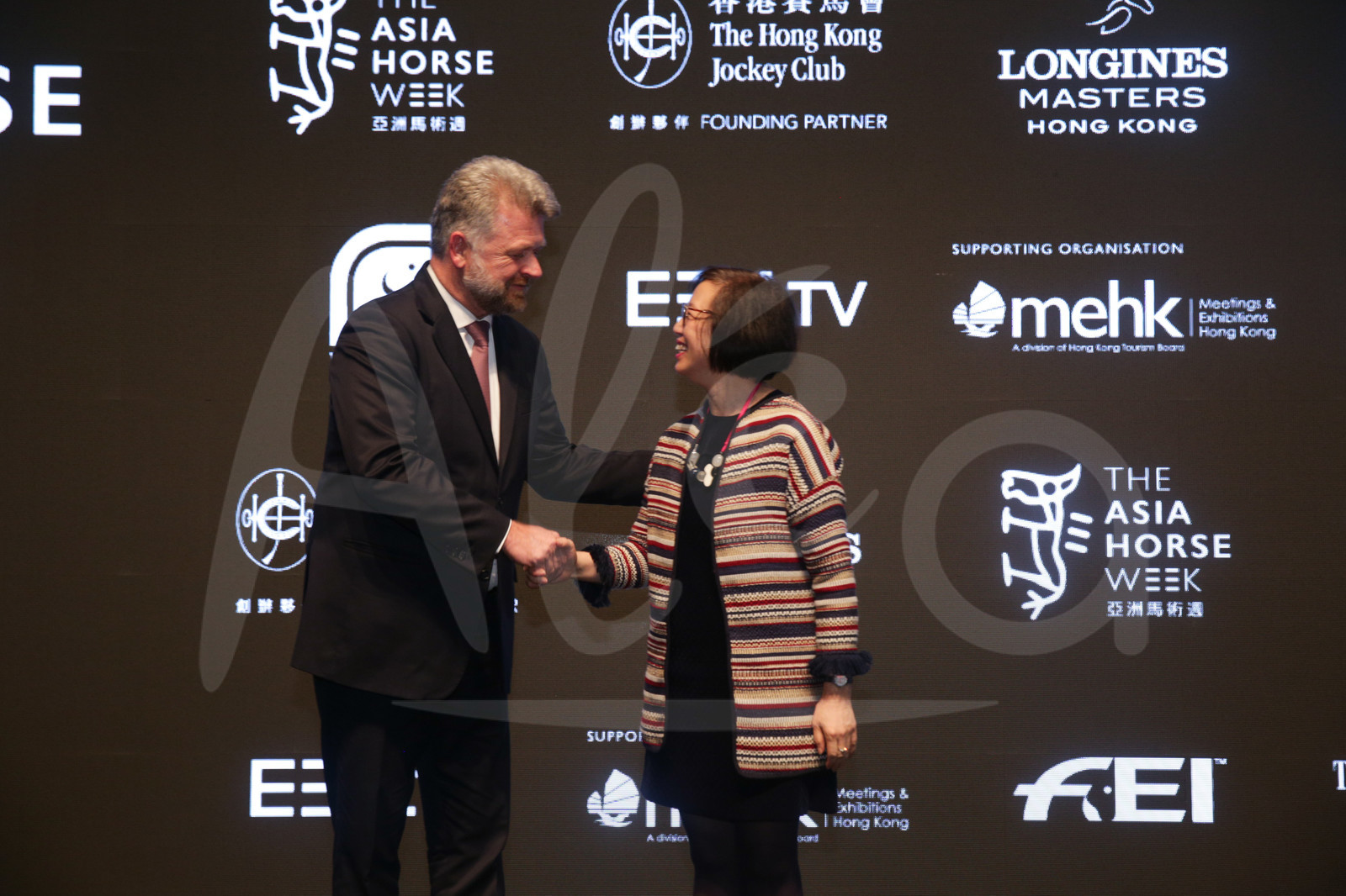 | Description | Christophe Ameeuw (PDG EEM) and Sophia CHAN, government official, during the closing ceremony of the Asia Horse Week Day 2 at the Longines Masters Hong Kong 2019, at Asia World Expo on February 15th, 2019 - Photo Isaac Lawrence / Mazarine / EEM |