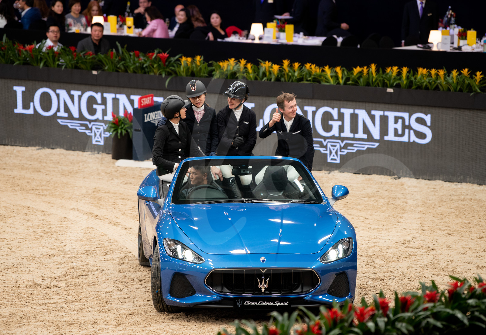 | Description | Int. six bars jumping competition - Masters Power Maserati Trophy, winners co-ex ALLEN, Bertram / IRL, CORDON, Pilar / ESP, WANG, Ella / CHN, RENWICK, Laura / GBR touring in the convertible at the Longines Masters Hong Kong 2019, at Asia World Expo on February 16th, 2019 - Photo Jayne Russell / Mazarine / EEM |