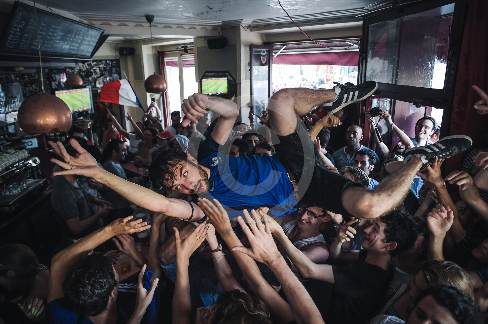 | Description | Illustration ambiance French football fans in a bar during the 2018 World Cup final after France had beaten Croatia, in Paris on July 15th, 2018 - Photo Lucas Barioulet |