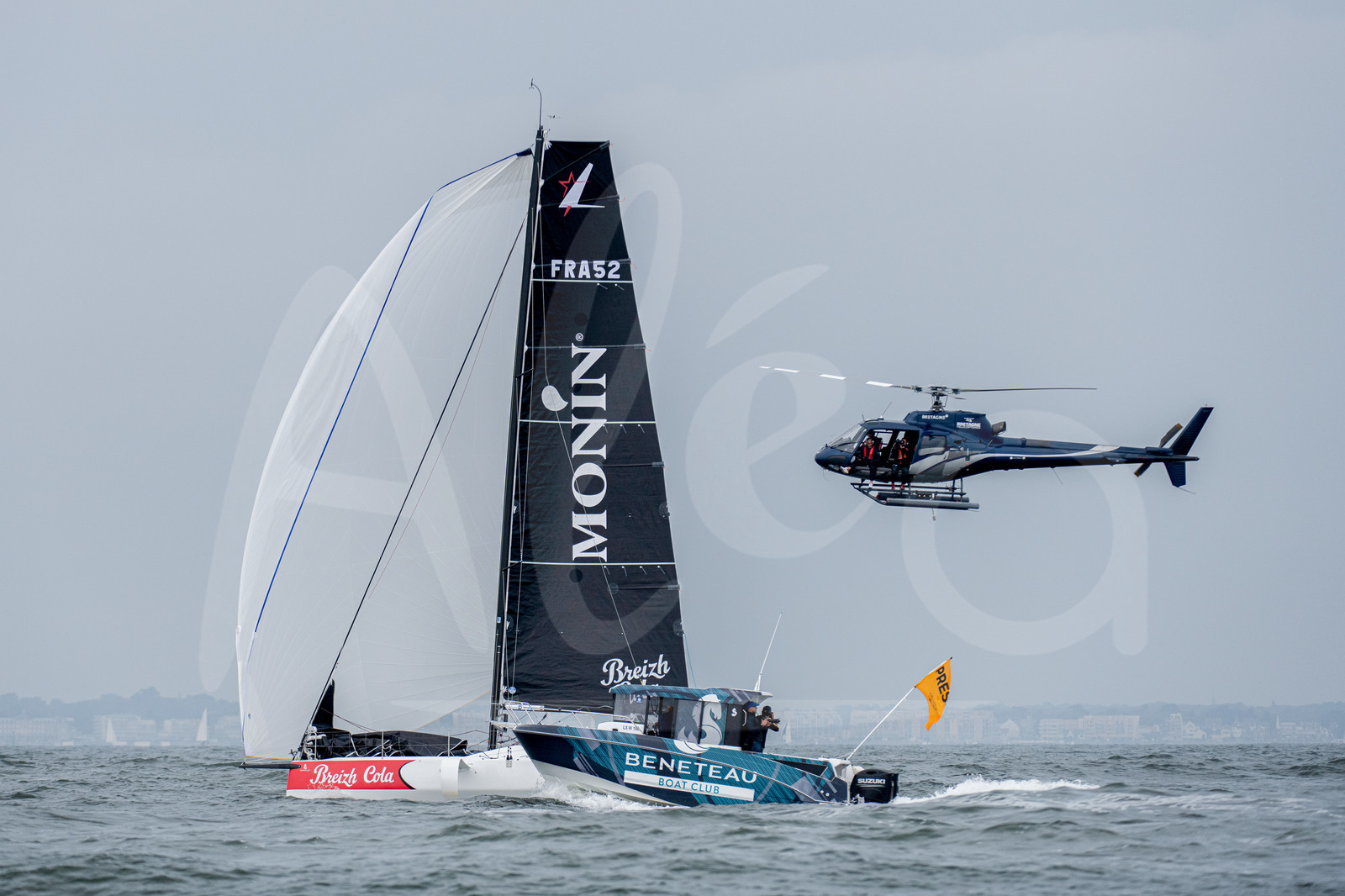 | Description | NANTES, FRANCE - JUNE 02: Morgan Lagraviere sailing on Breizh Cola Monin followed by press boat and helicopter during the start of Stage 1 of the 50th Anniversary of the Solitaire Urgo Le Figaro on June 2, 2019 off Pornichet, near Nantes, France. The Solitaire Urgo Le Figaro will be raced over four legs between Nantes (France), Kinsale (Ireland), Roscoff (France) and Dieppe (France). (Photo by Olivier Blanchet/Alea) |