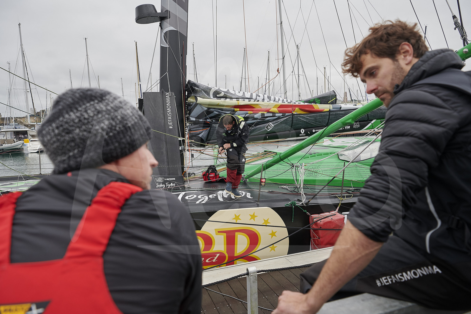 | Description | BREST, FRANCE - OCTOBER 28: Transat Jacques Vabre 2019 Imoca V&B - Mayenne skippers Maxime Sorel and Guillaume Le Brec are making a technical stop to check an incident with their port outrigger, in Brest on October 28, 2019. (Photo by Yvan Zedda/Alea via Getty Images) |