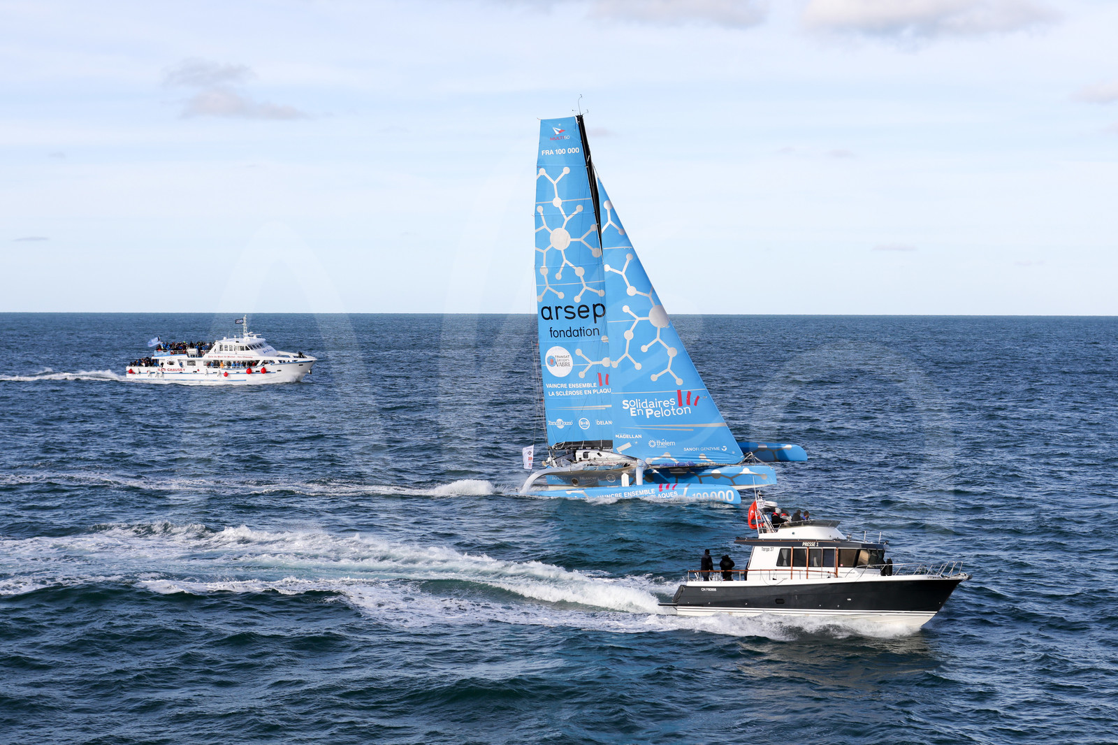 | Description | LE HAVRE, FRANCE - OCTOBER 27: Multi 50 Solidaires en Peloton - Arsep, skippers Thibault Vauchel-Camus and Fred Duthil, is followed by guests motorboats during start of the Transat Jacques Vabre 2019, duo sailing race from Le Havre, France, to Salvador de Bahia, Brazil, on October 27, 2019 in Le Havre, France. (Photo by Jean-Marie Liot/Alea) |