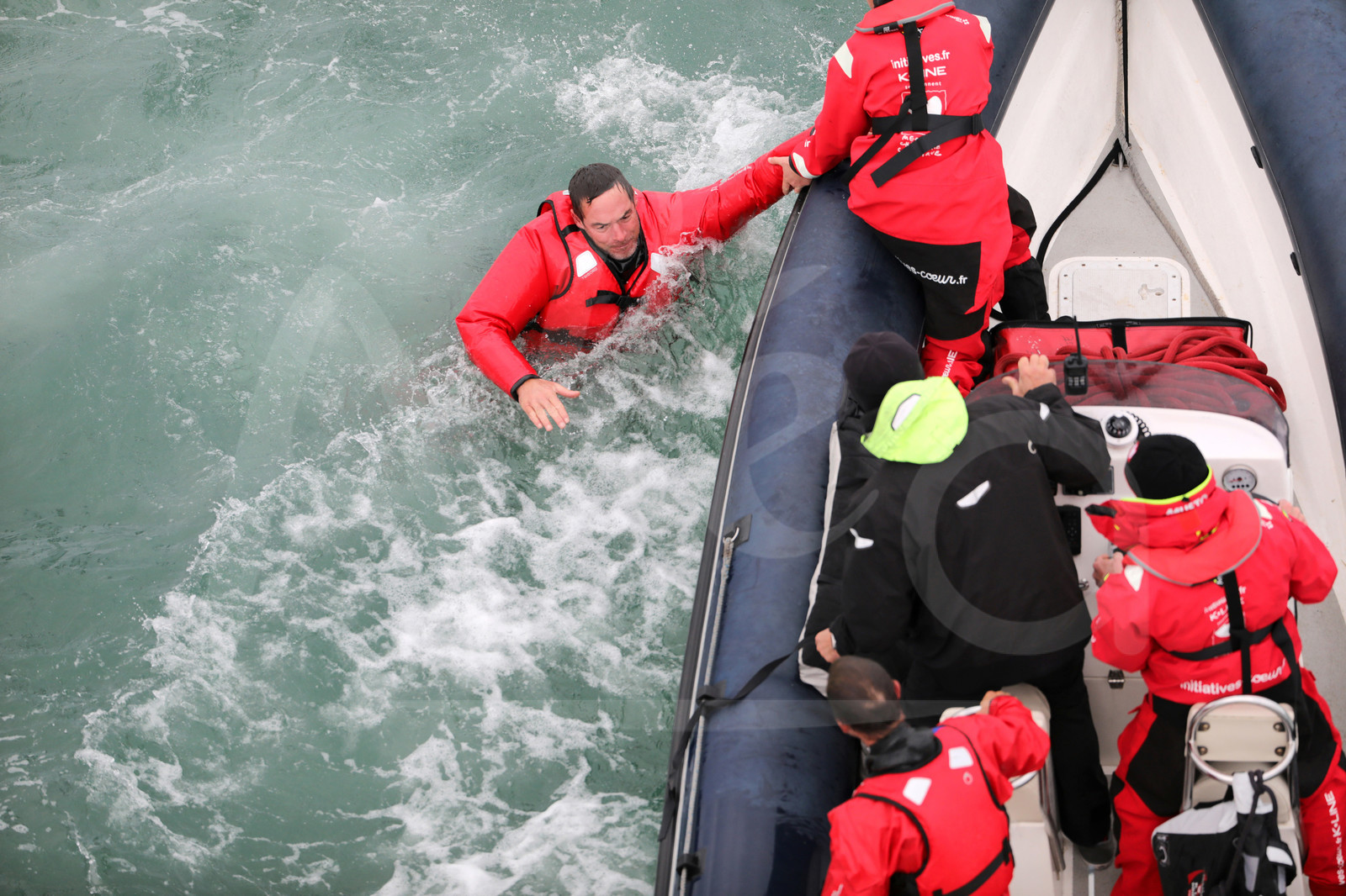 | Description | LE HAVRE, FRANCE - OCTOBER 27: A crew member of Imoca Initiatives Coeur is retrieved on a team rib after jumping into the water from the outrigger to leave the boat prior to the start of the Transat Jacques Vabre 2019, duo sailing race from Le Havre, France, to Salvador de Bahia, Brazil, on October 27, 2019 in Le Havre, France. (Photo by Jean-Marie Liot/Alea) |
