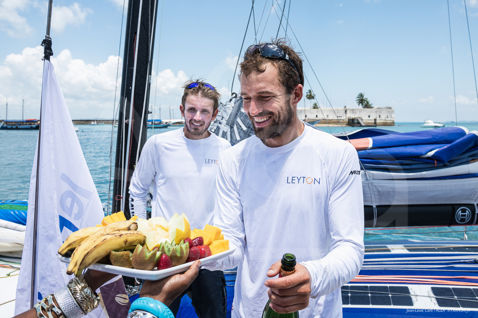 | Description | SALVADOR DE BAHIA, BRAZIL - NOVEMBER 14: Leyton skippers Fabien Delahaye and Sam Goodchild celebrate with fresh fruits taking 2nd place in the Class 40 category of the Transat Jacques Vabre 2019 on November 14, 2019 in Bahia, Brazil. Transat Jacques Vabre is a duo sailing race from Le Havre, France, to Salvador de Bahia, Brazil. (Photo by Jean-Louis Carli/Alea) |