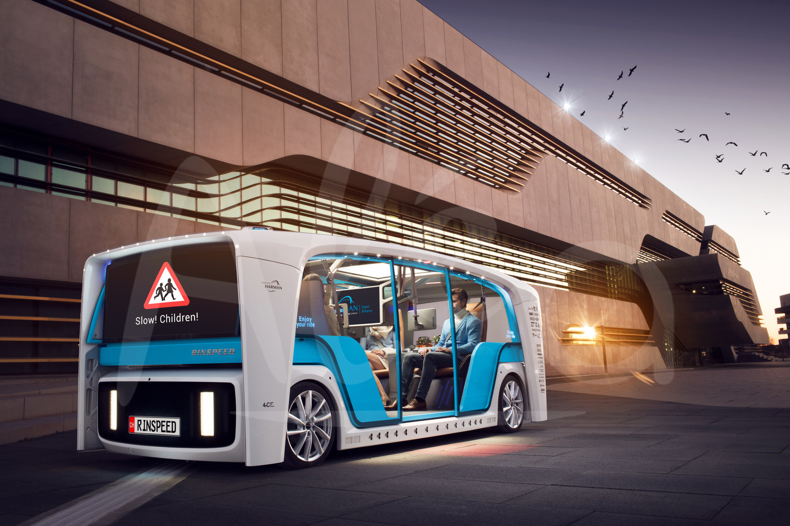 Description | Photo accompagnant les vidéos réalisées pour RINSPEED, avant leur présentation de solutions d'avenir, connectées, autonomes et polyvalentes, au salon de Las Vegas.Photo Dingo |