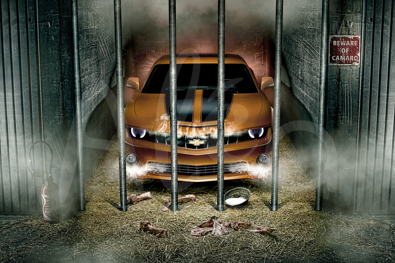 Description | Photo de pub pour la Chevrolet Camaro surboostée, dans l'esprit mise en scène à la Dingo.Photo Dingo |