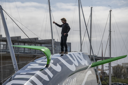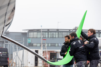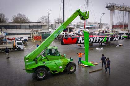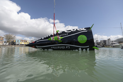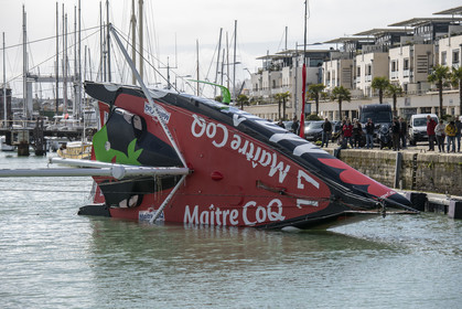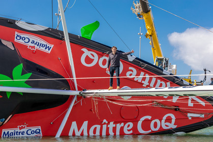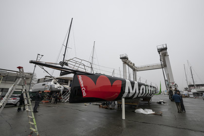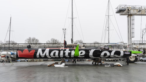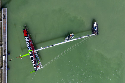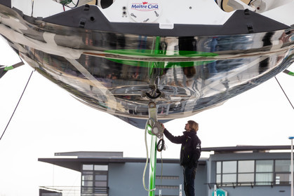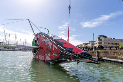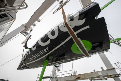 Selection d'images de la mise à l'eau et du test de redressement à 90° du voilier Imoca Maitre Coq du skipper Yannick Bestaven, à La Rochelle, les 11 et 13 Mars derniers. Le skipper et son bateau vont participer au Vendée Globe 2020.