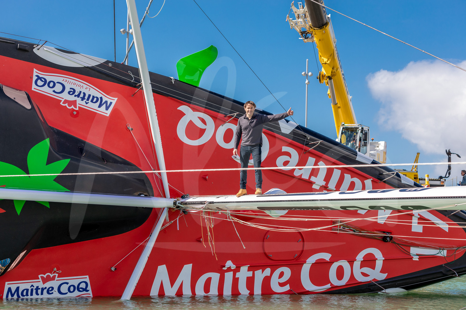 Description | LA ROCHELLE, FRANCE - MARCH 13: Skipper Yannick Bestaven is portraited on the mast of his Imoca boat Maitre Coq having a straightening test, on March 13, 2020, in La Rochelle, France. (Photo by Jean-Marie Liot/Alea) |