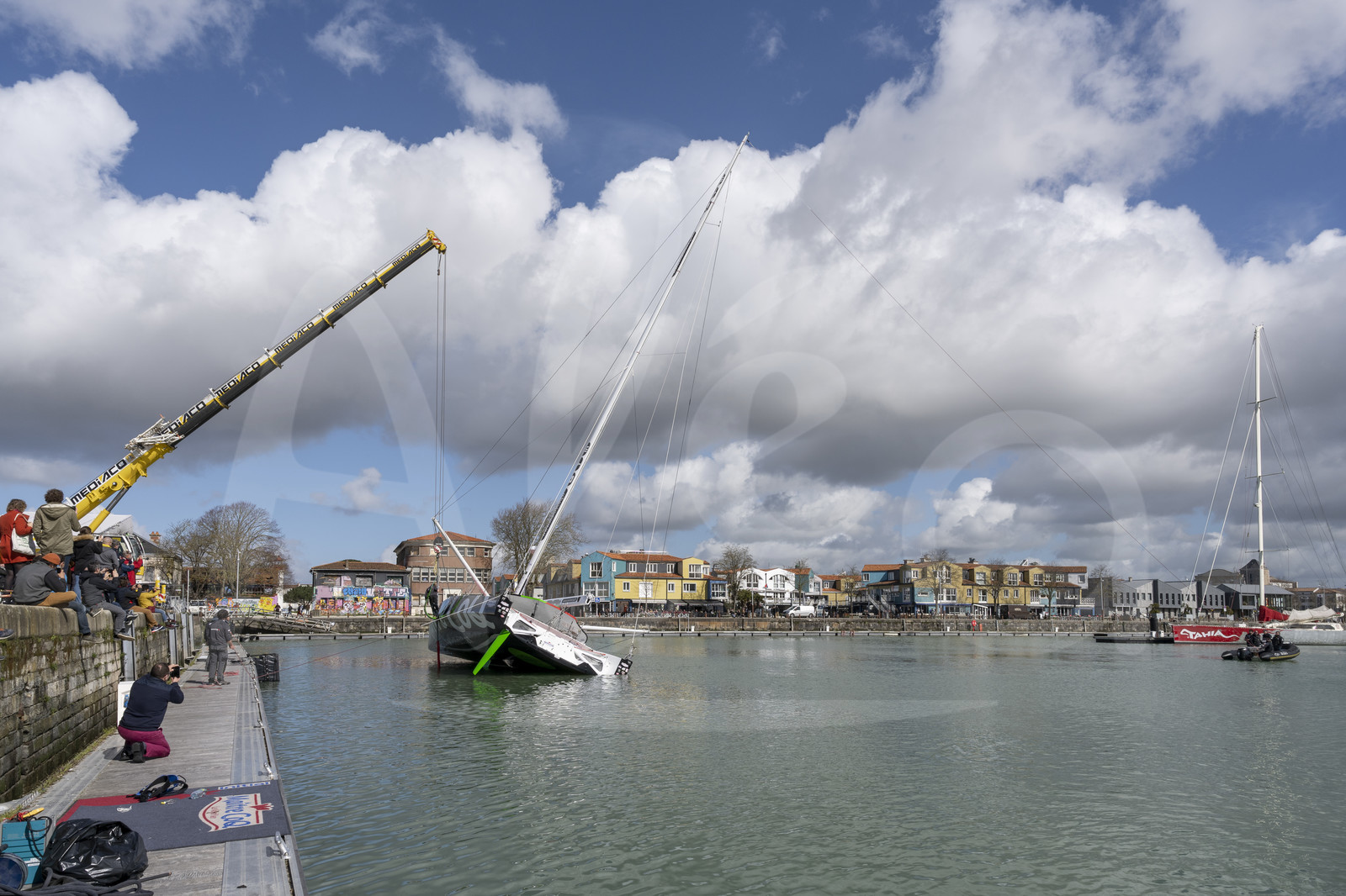 Description | LA ROCHELLE, FRANCE - MARCH 13: The Imoca boat Maitre Coq, skipper Yannick Bestaven, is having a straightening test powered by a crane before her launching, on March 13, 2020, in La Rochelle, France. (Photo by Olivier Blanchet/Alea) |