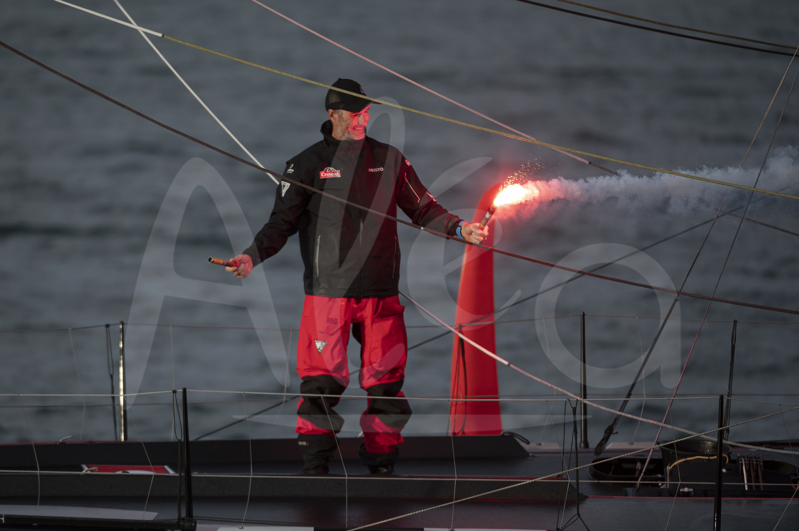 Description | LES SABLES D'OLONNE, FRANCE - JULY 14: Imoca Charal, skipper Jérémie Beyou (FRA), celebrates with flares taking 1st place of the Vendee Arctique solo sailing race, off Les Sables d'Olonne, France, on July 14, 2020. (Photo by Olivier Blanchet/Alea) |