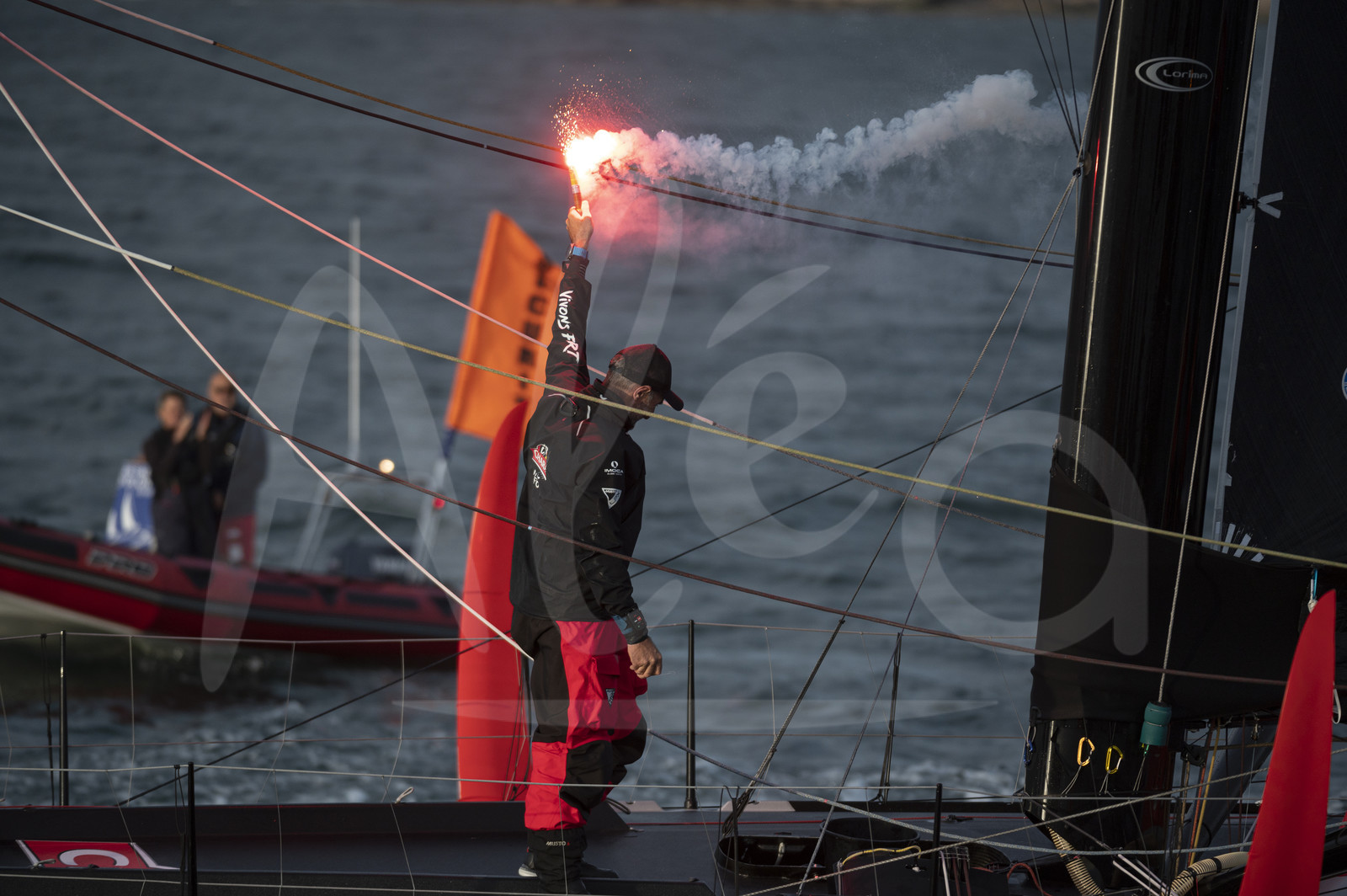 Description | LES SABLES D'OLONNE, FRANCE - JULY 14: Imoca Charal, skipper Jérémie Beyou (FRA), celebrates with flares taking 1st place of the Vendee Arctique solo sailing race, off Les Sables d'Olonne, France, on July 14, 2020. (Photo by Olivier Blanchet/Alea) |