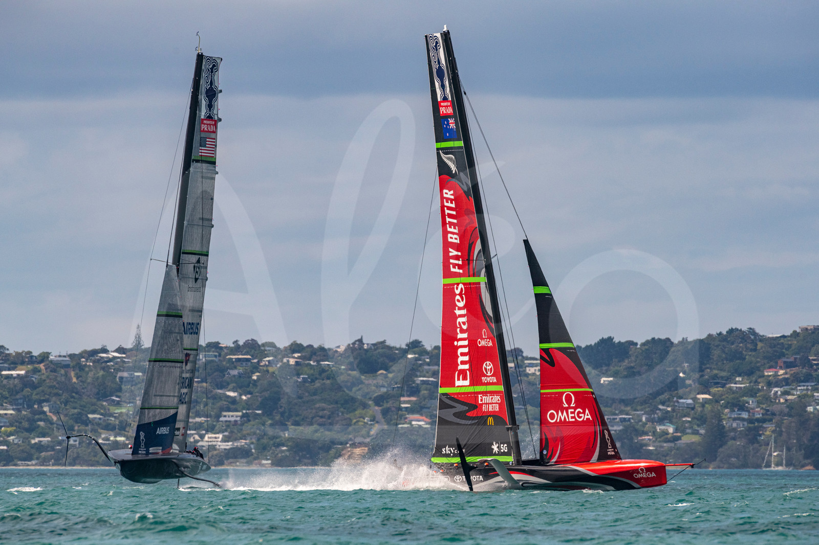 | Description | AUCKLAND, NEW-ZEALAND - DECEMBER 8: Emirates Team New Zealand and America Magic. America's Cup Challengers and the Defender participate in organised practice on the course E race area for the Prada Cup and America's Cup, off Auckland, New-Zealand, on December 8, 2020. (photo by Chris Cameron/Alea) |