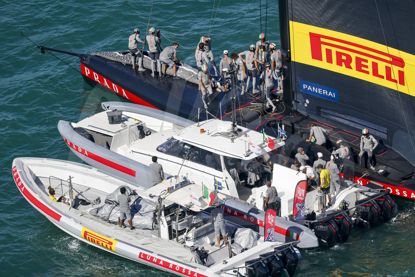 Description | AUCKLAND, NEW-ZEALAND - FEBRUARY 13: Luna Rossa Prada Pirelli Team support boats are illustrated before Prada Cup 2021 final, off Auckland, New-Zealand, on February 13, 2021. (photo by Carlo Borlenghi/Alea) |