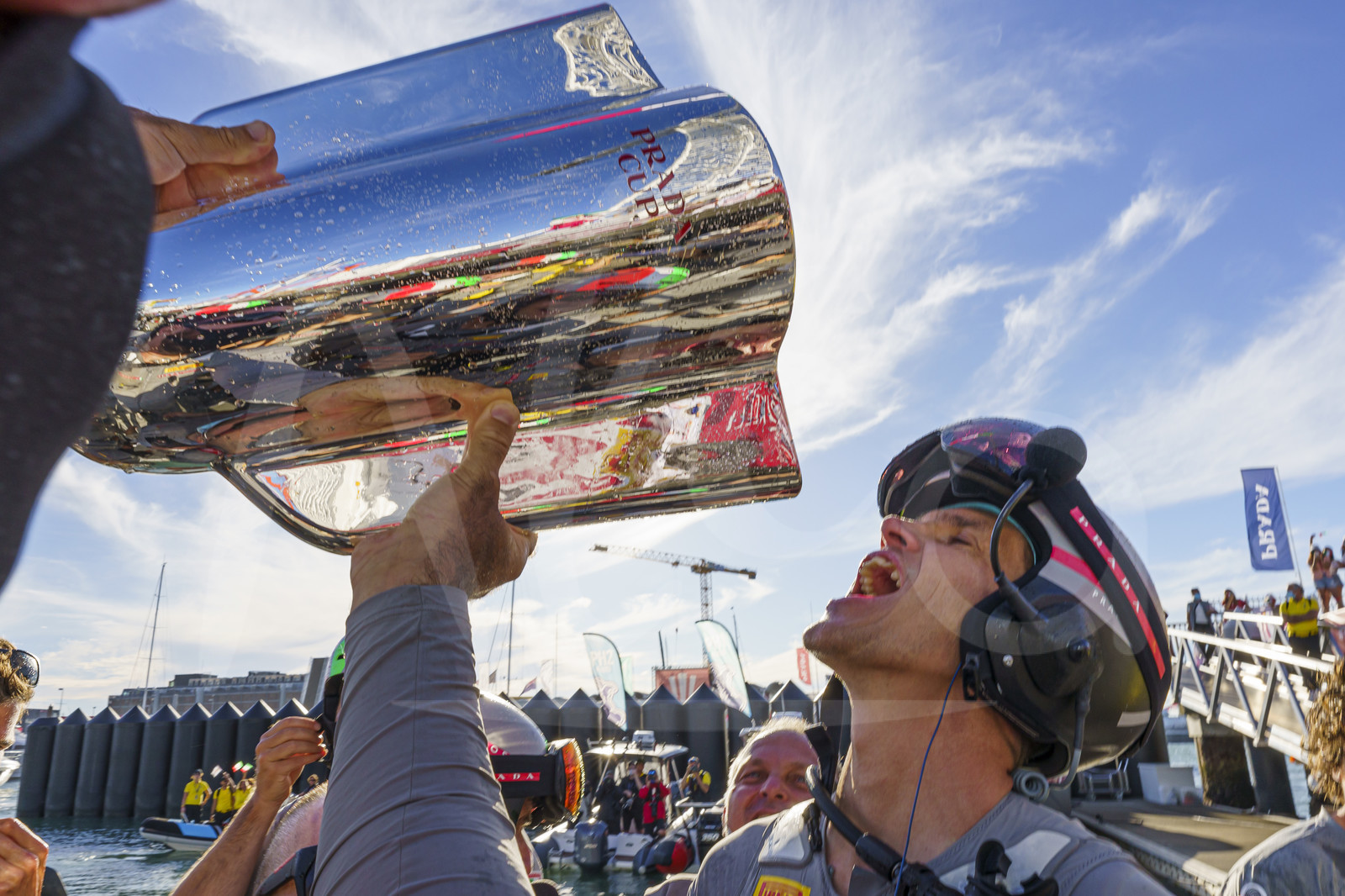 Description | AUCKLAND, NEW-ZEALAND - FEBRUARY 21: Luna Rossa Prada Pirelli Team and sailor Pietro Sibello celebrate with champagne and receives PRADA Cup Trophy after winning the Prada Cup 2021 final, off Auckland, New-Zealand, on February 21, 2021. (photo by Luca Butto/Alea) |