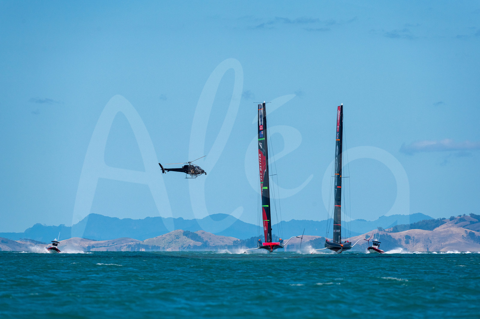Description | AUCKLAND, NEW-ZEALAND - JANUARY 11: INEOS Team UK and Emirates Team New Zealand are pictured during an America's Cup practice session on the Waitemata Harbour off Auckland, New-Zealand, on January 11, 2021. (photo by Chris Cameron/Alea) |