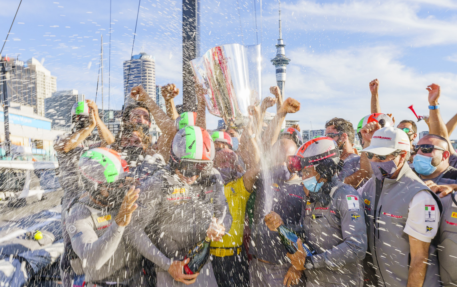 Description | AUCKLAND, NEW-ZEALAND - FEBRUARY 21: Luna Rossa Prada Pirelli Team celebrates with champagne and receives PRADA Cup Trophy after winning the Prada Cup 2021 final, off Auckland, New-Zealand, on February 21, 2021. (photo by Luca Butto/Alea) |