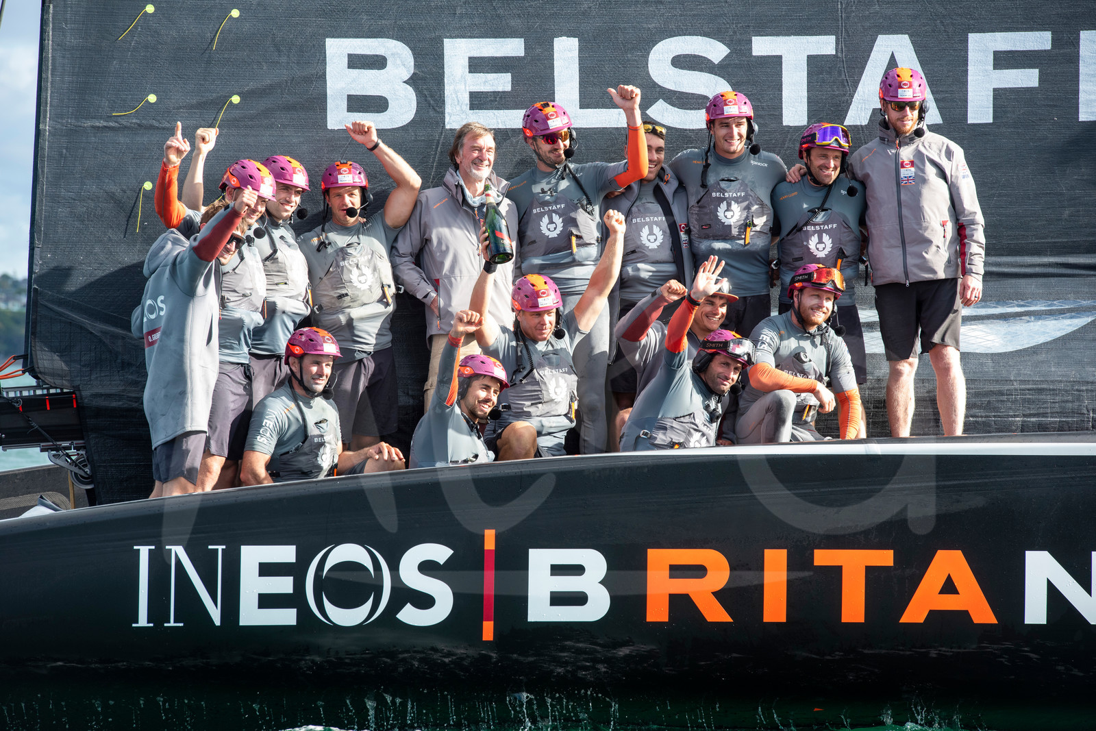 Description | AUCKLAND, NEW-ZEALAND - JANUARY 23: INEOS Team UK celebrate on board Britania with Sir Jim Ratcliffe after winning the Round Robin section of the Prada Cup in Auckland, New-Zealand, on January 23, 2021. (photo by Chris Cameron/Alea) |