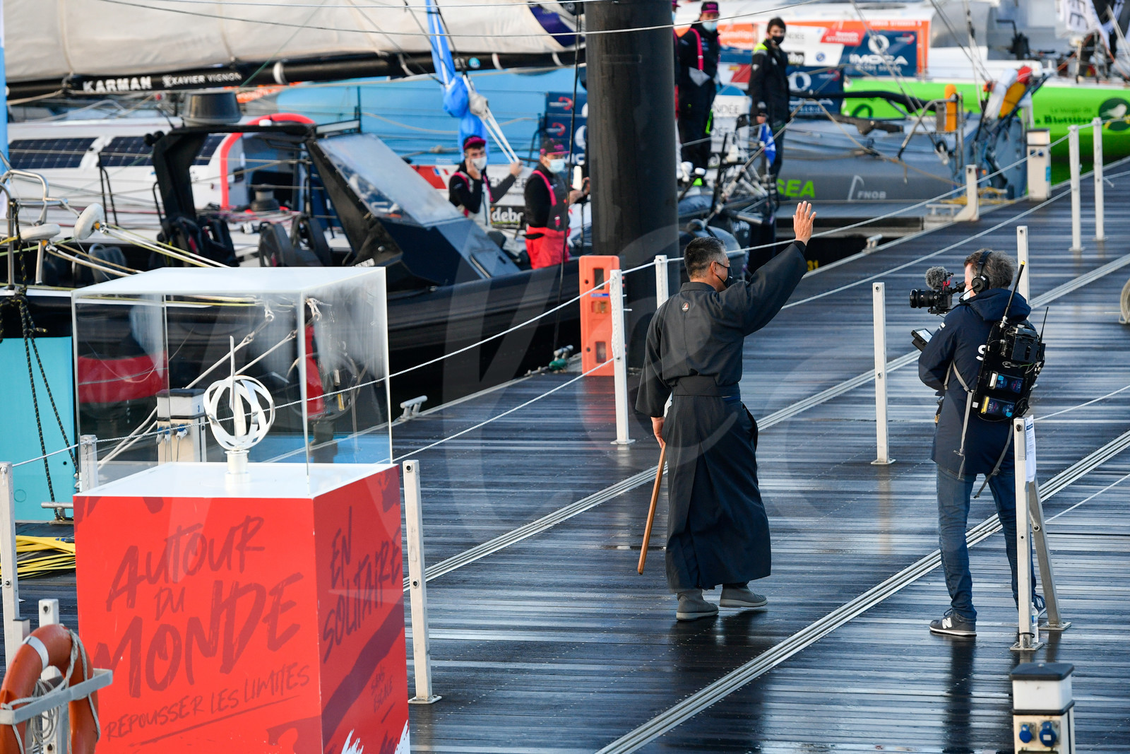 Description | LES SABLES D’OLONNE, FRANCE - NOVEMBER 8: Skipper Kojiro Shiraishi, DMG Mori Global One is portraited at pontoons with trophy before the start of the Vendee Globe sailing race in les Sables d’Olonne, France, on November 8, 2020. (Photo by Jean-Louis Carli/Alea) |