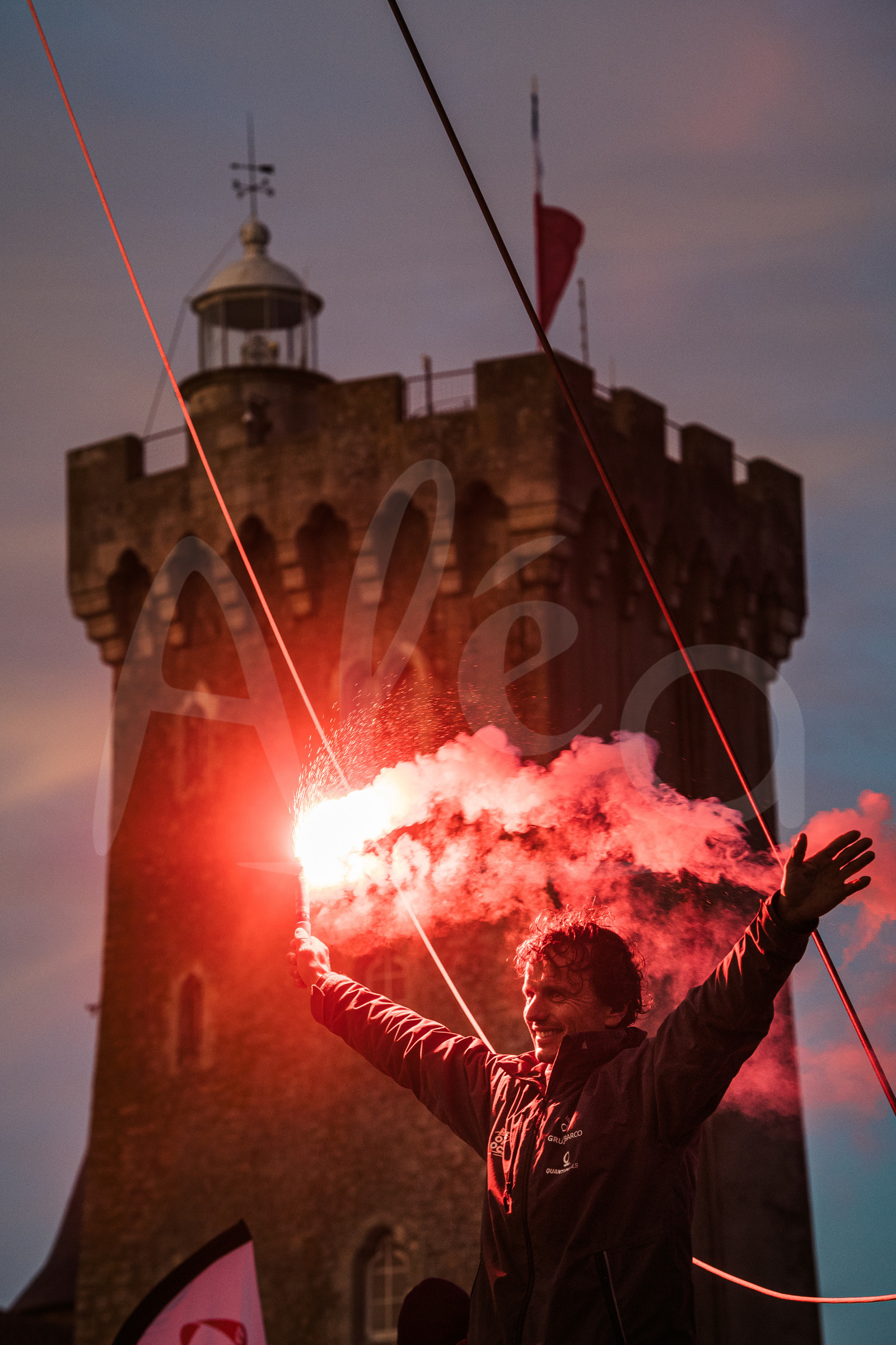 Description | #EN# LES SABLES D’OLONNE, FRANCE - FEBRUARY 14: Skipper Didac Costa (ESP), One Planet One Ocean, is pictured celebrating with flares in channel after arrival of the Vendee Globe sailing race, on February 14, 2021. (Photo by Jean-Louis Carli/Alea) #FR# LES SABLES D’OLONNE, FRANCE - 14 FEVRIER: Le skipper Didac Costa (ESP), One Planet One Ocean, est photographié célébrant avec des feux à main dans le chenal après son arrivée du Vendee Globe, le 14 Février 2021. (Photo Jean-Louis Carli/Alea) |