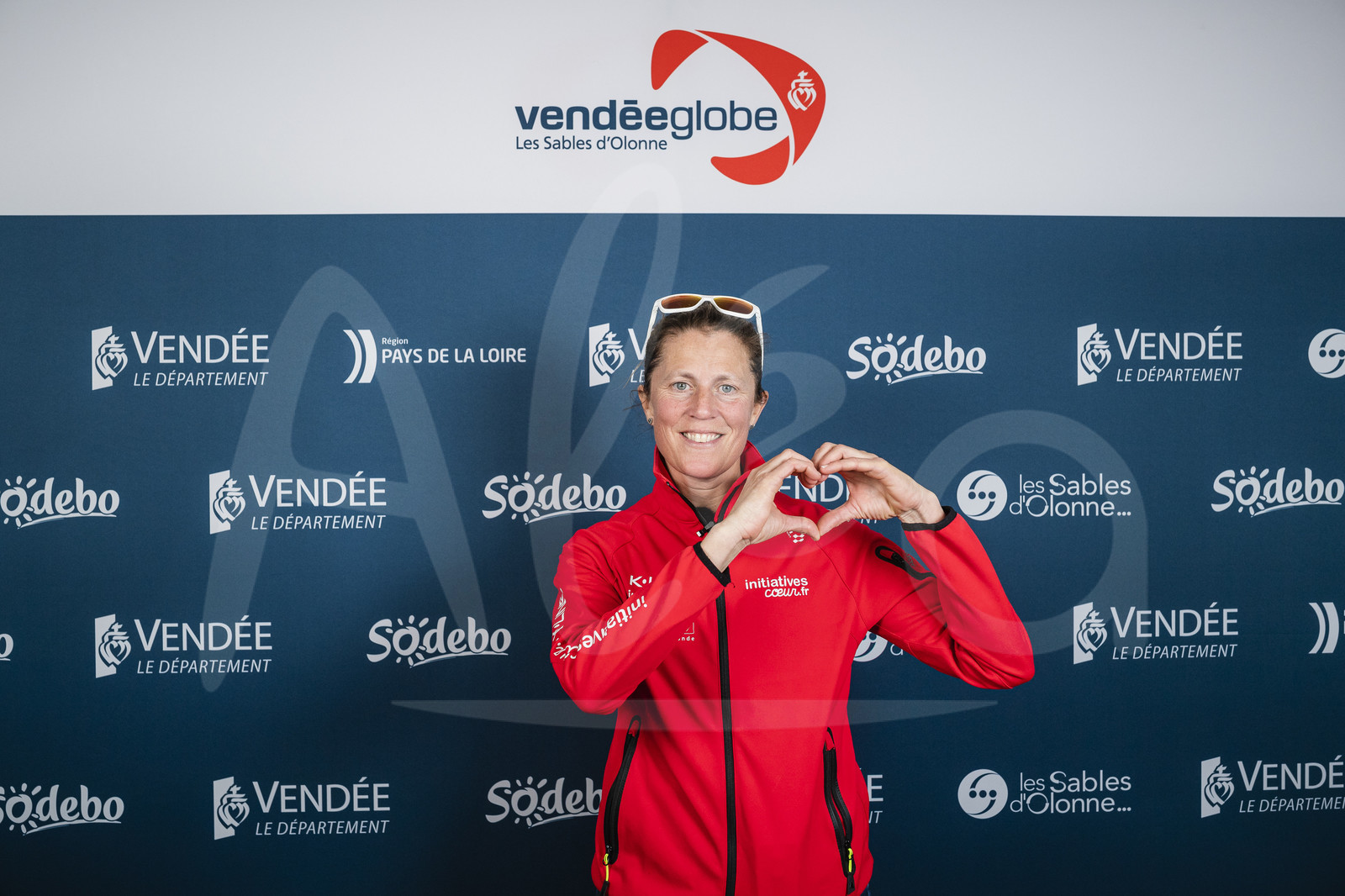 Description | #EN# LES SABLES D’OLONNE, FRANCE - FEBRUARY 26: Skipper Sam Davies (GBR), Initiatives Coeur, is portraited before the official backdrop during arrival after retiring from the Vendee Globe sailing race, on February 26, 2021. (Photo by Jean-Louis Carli/Alea) #FR# LES SABLES D’OLONNE, FRANCE - 26 FEVRIER: La skipper Sam Davies, Initiatives Coeur, est photographiée devant le backdrop officiel pendant son arrivée après avoir du abandonner la course du Vendee Globe, le 26 Février 2021. (Photo Jean-Louis Carli/Alea) |