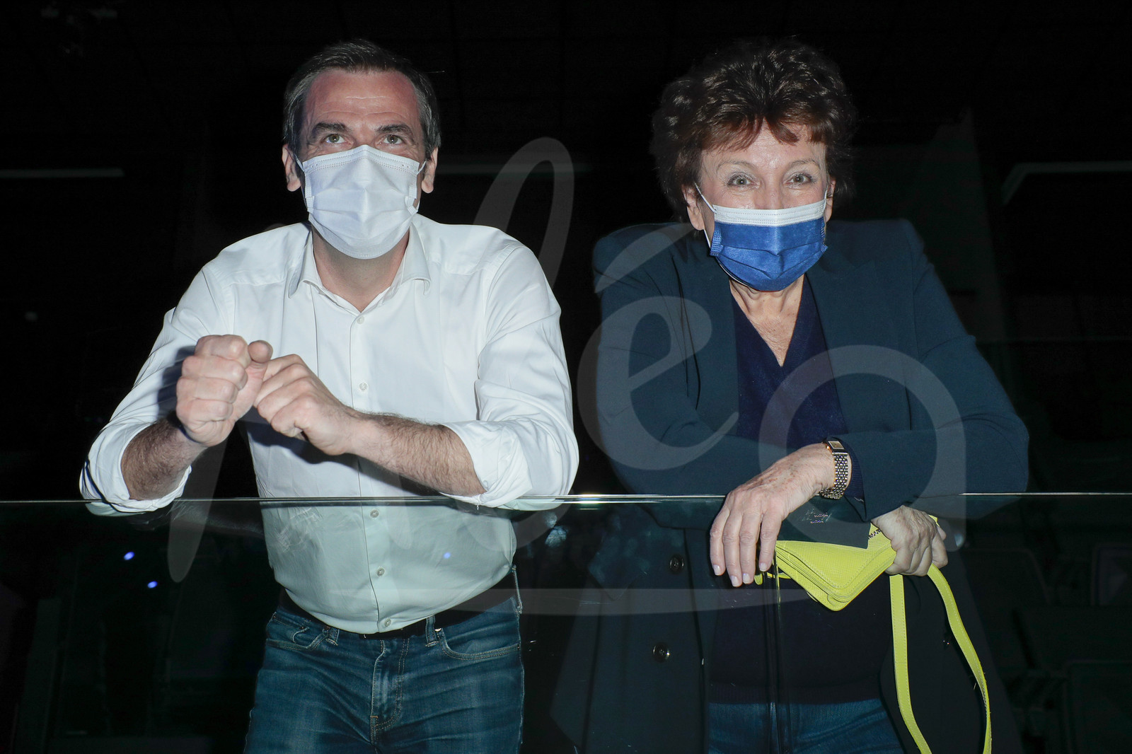 PARIS, FRANCE - 29 MAI: Olivier Veran (Ministre de la Santé) est photographié avec Roselyne Bachelot (Ministre de la Culture) lors de l’étude médicale et concert test Ambition Live Again qui se déroule à l’AccorHotels Arena de Paris, le 29 Mai 2021. (Photo Stéphane Allaman/Alea)