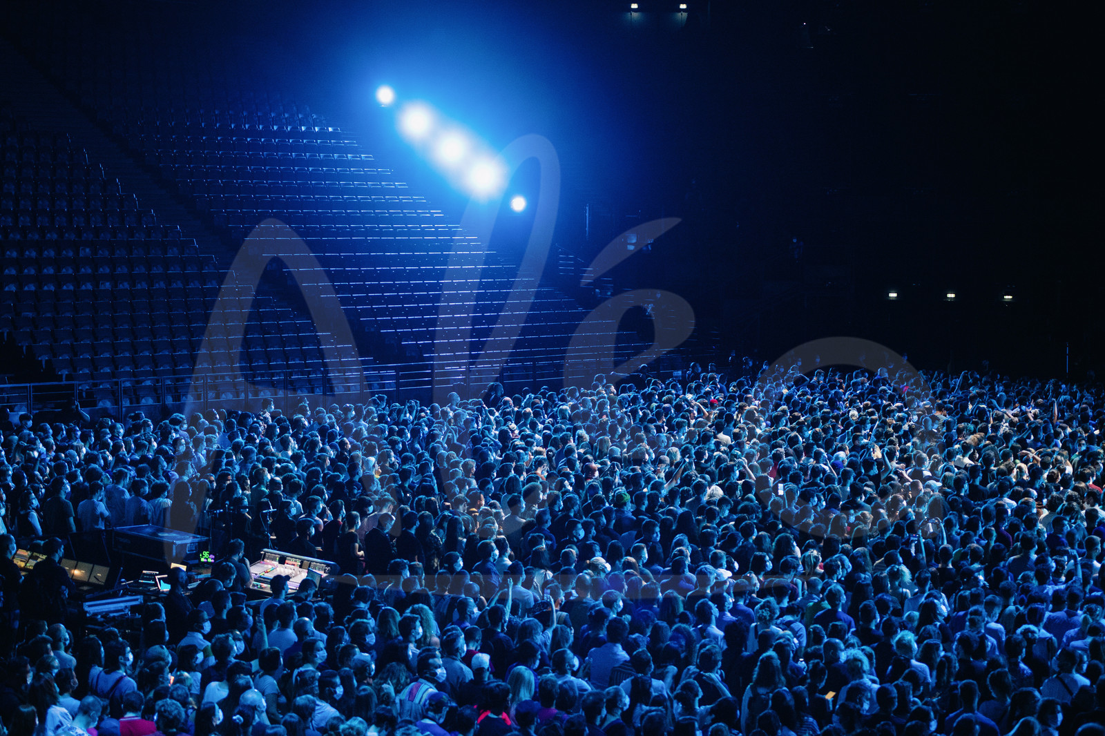 DescriptionPARIS, FRANCE - 29 MAI: Le public masqué et testé assiste à un concert du groupe Indochine lors de l’étude médicale et concert test Ambition Live Again qui se déroule à l’AccorHotels Arena de Paris, le 29 Mai 2021. (Photo Jean-Louis Carli/Alea)