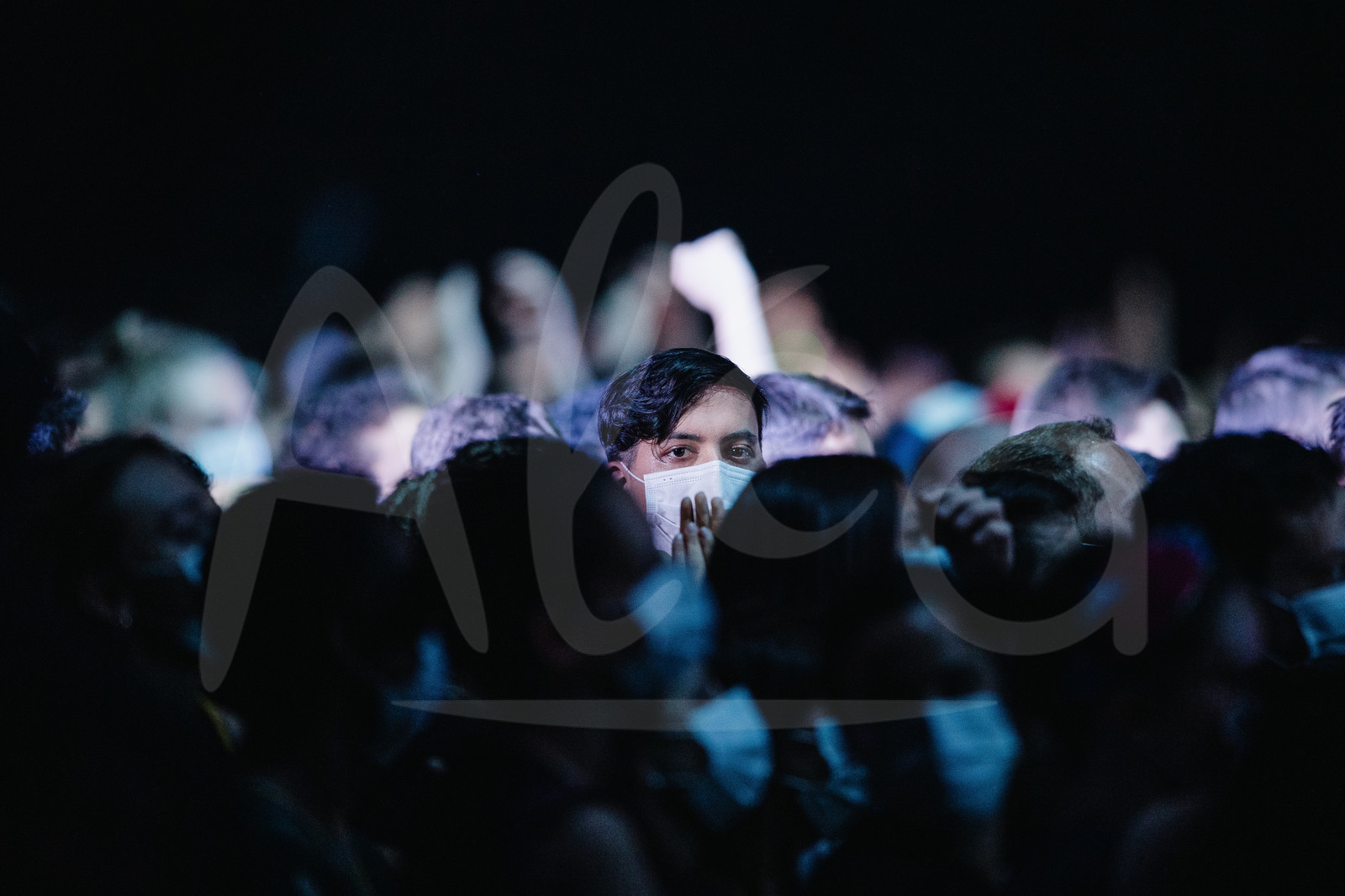 DescriptionPARIS, FRANCE - 29 MAI: Le public masqué et testé assiste à un concert du groupe Indochine lors de l’étude médicale et concert test Ambition Live Again qui se déroule à l’AccorHotels Arena de Paris, le 29 Mai 2021. (Photo Jean-Louis Carli/Alea)