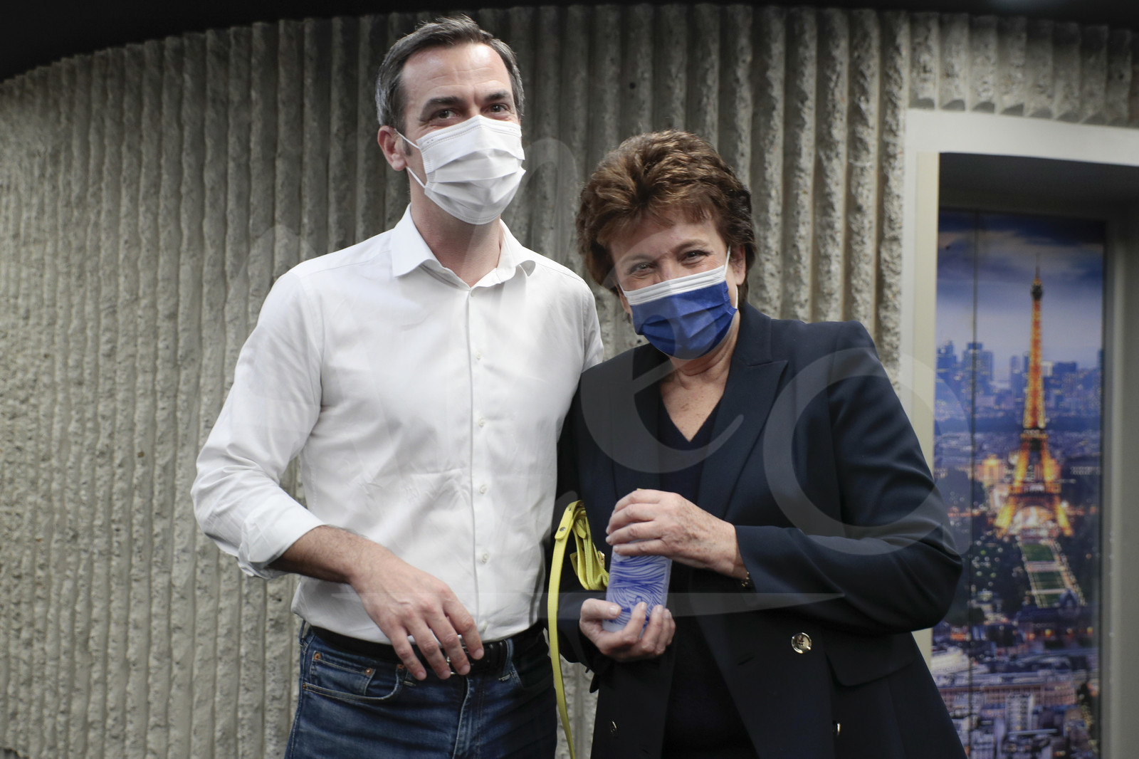 PARIS, FRANCE - 29 MAI: Olivier Veran (Ministre de la Santé) est photographié avec Roselyne Bachelot (Ministre de la Culture) lors de l’étude médicale et concert test Ambition Live Again qui se déroule à l’AccorHotels Arena de Paris, le 29 Mai 2021. (Photo Stéphane Allaman/Alea)