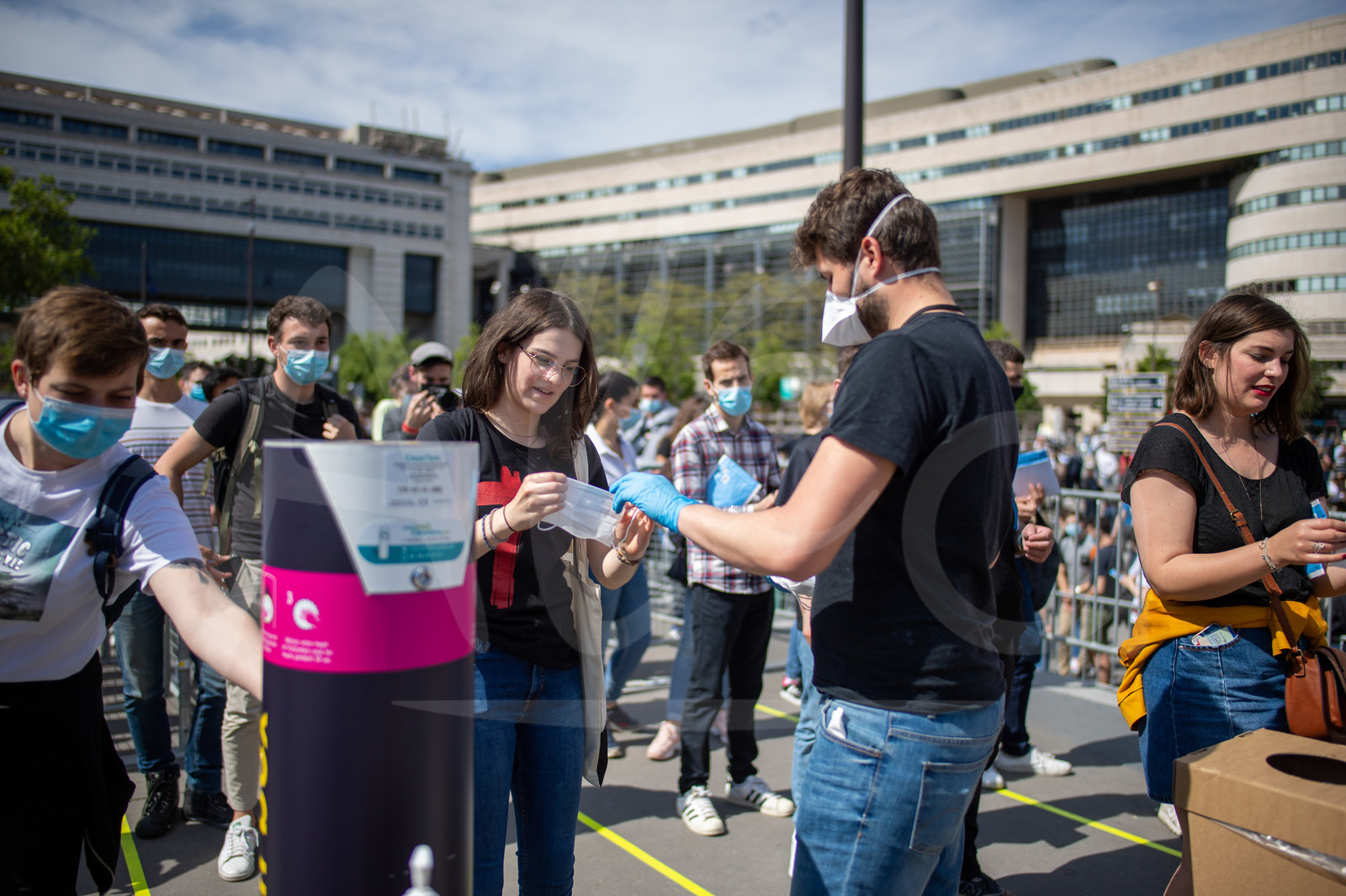 PARIS, FRANCE - 29 MAI: Des masques et du gel sont distribués au public dans le cadre du protocole lors de l’étude médicale et concert test Ambition Live Again qui se déroule à l’AccorHotels Arena de Paris, le 29 Mai 2021. (Photo Jean-Louis Carli/Alea)