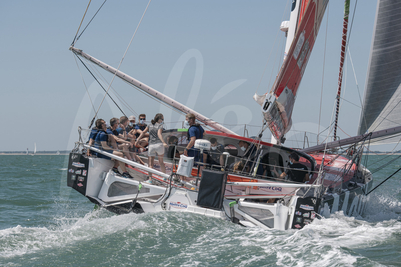 Description | LA ROCHELLE, FRANCE - JUNE 14: Members of the PAF, Patrouille Aerienne de France, are sailing on Imoca Maitre Coq with winner of the Vendee Globe Yannick Bestaven, on June 14, 2021 in La Rochelle, France. (Photo by Olivier Blanchet / Alea) |