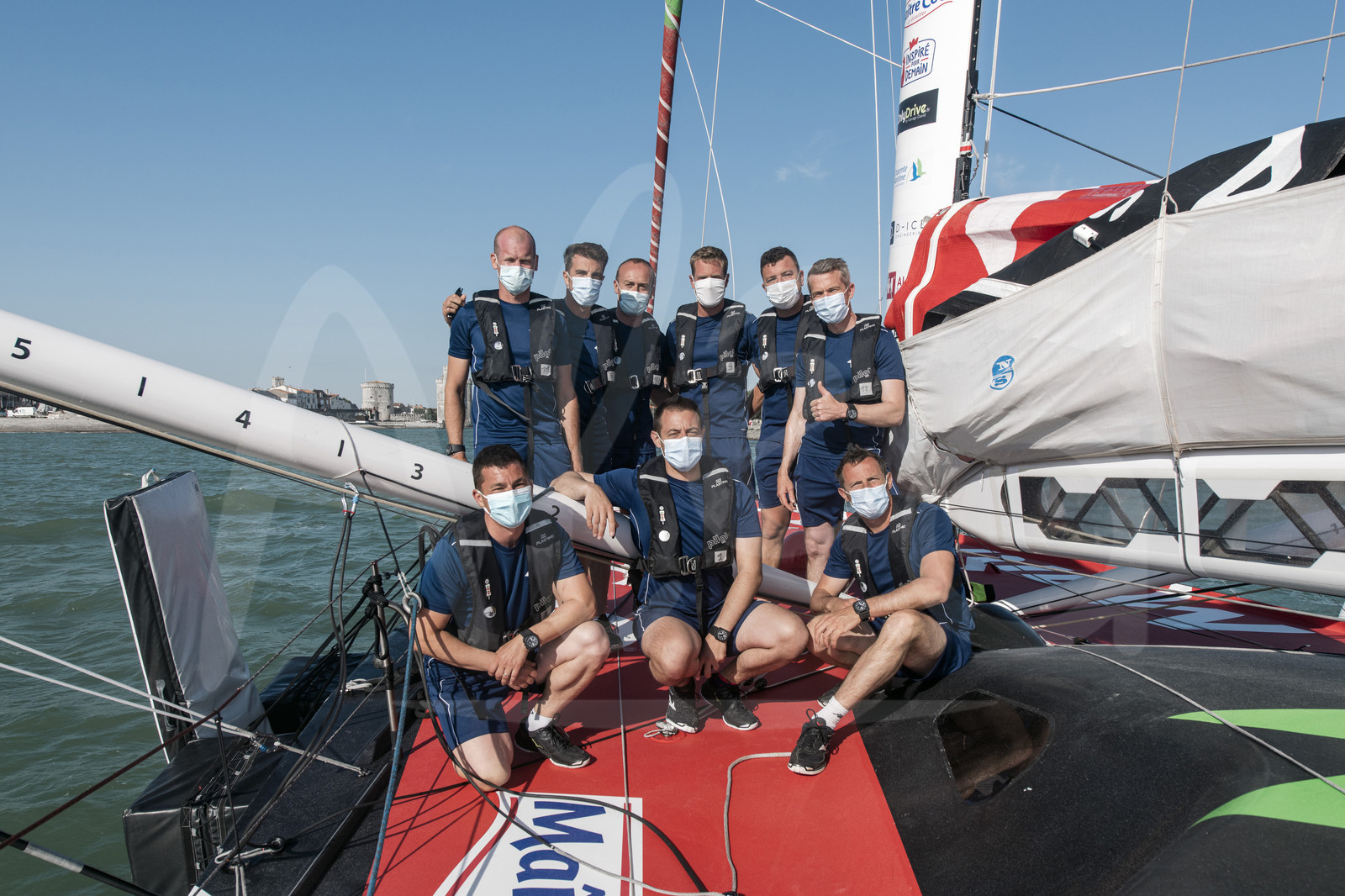 | Description | LA ROCHELLE, FRANCE - JUNE 14: Members of the PAF, Patrouille Aerienne de France, are sailing on Imoca Maitre Coq with winner of the Vendee Globe Yannick Bestaven, on June 14, 2021 in La Rochelle, France. (Photo by Olivier Blanchet / Alea) |