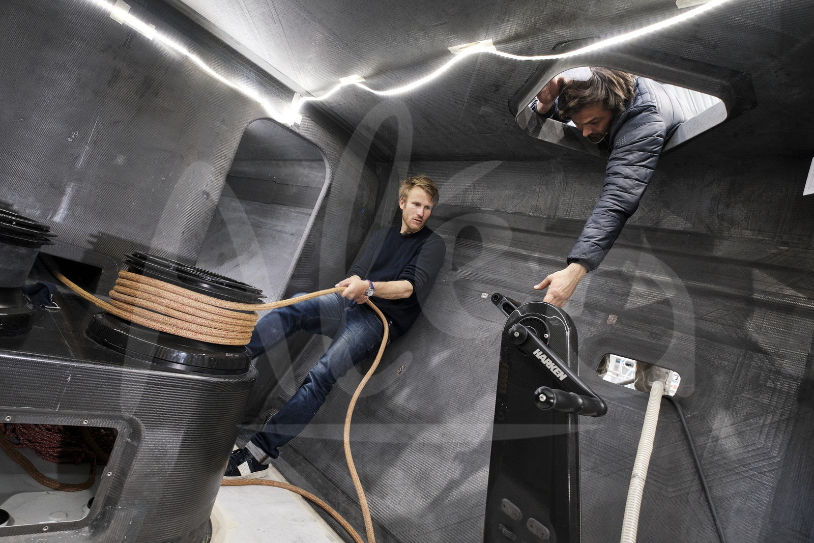 | Description | Mer Concept - construction du trimaran M101 à Concarneau - François Gabart et Guillaume Combescure (Ingénieur Responsable Performance) réfléchissent sur la disposition de l'accastillage à l'intérieur du bateau - Photo Benoit Stichelbaut / Alea |