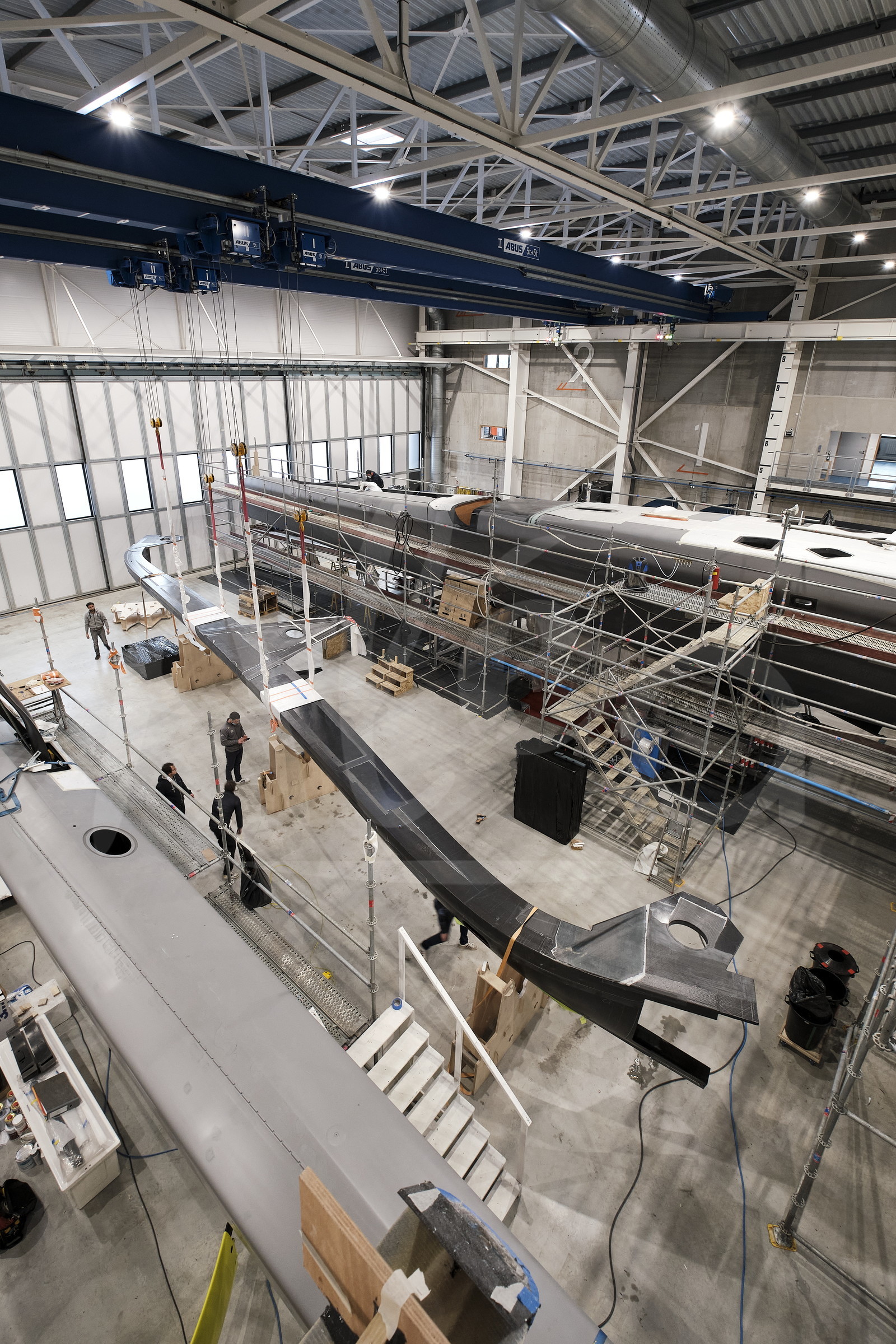 | Description | Construction du trimaran Ultim M101 (François Gabart) dans les locaux de Mer Concept à Concarneau le 21/01/2021 - Arrivée du bras avant construit chez CDK - Photo Benoit Stichelbaut / Alea |