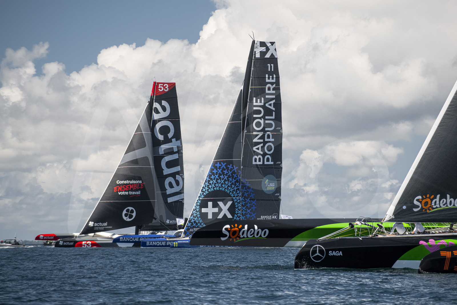 Description | CONCARNEAU, FRANCE - JULY 01: Ultim boats Banque Populaire, Actual Ultim 3 and Sodebo Ultim 3 are taking start of the sailing race Finistere Atlantique, on July 1, 2022 in Concarneau, France. (Photo by Vincent Curutchet/Alea) |