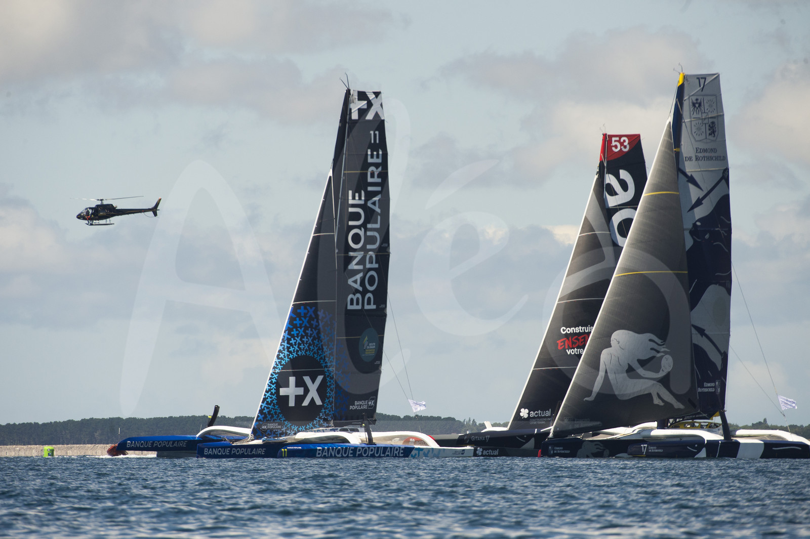 Description | CONCARNEAU, FRANCE - JULY 01: Ultim boats Banque Populaire, Actual Ultim 3 and Maxi Edmond de Rothschild are taking start of the sailing race Finistere Atlantique, on July 1, 2022 in Concarneau, France. (Photo by Vincent Curutchet/ALeA) |