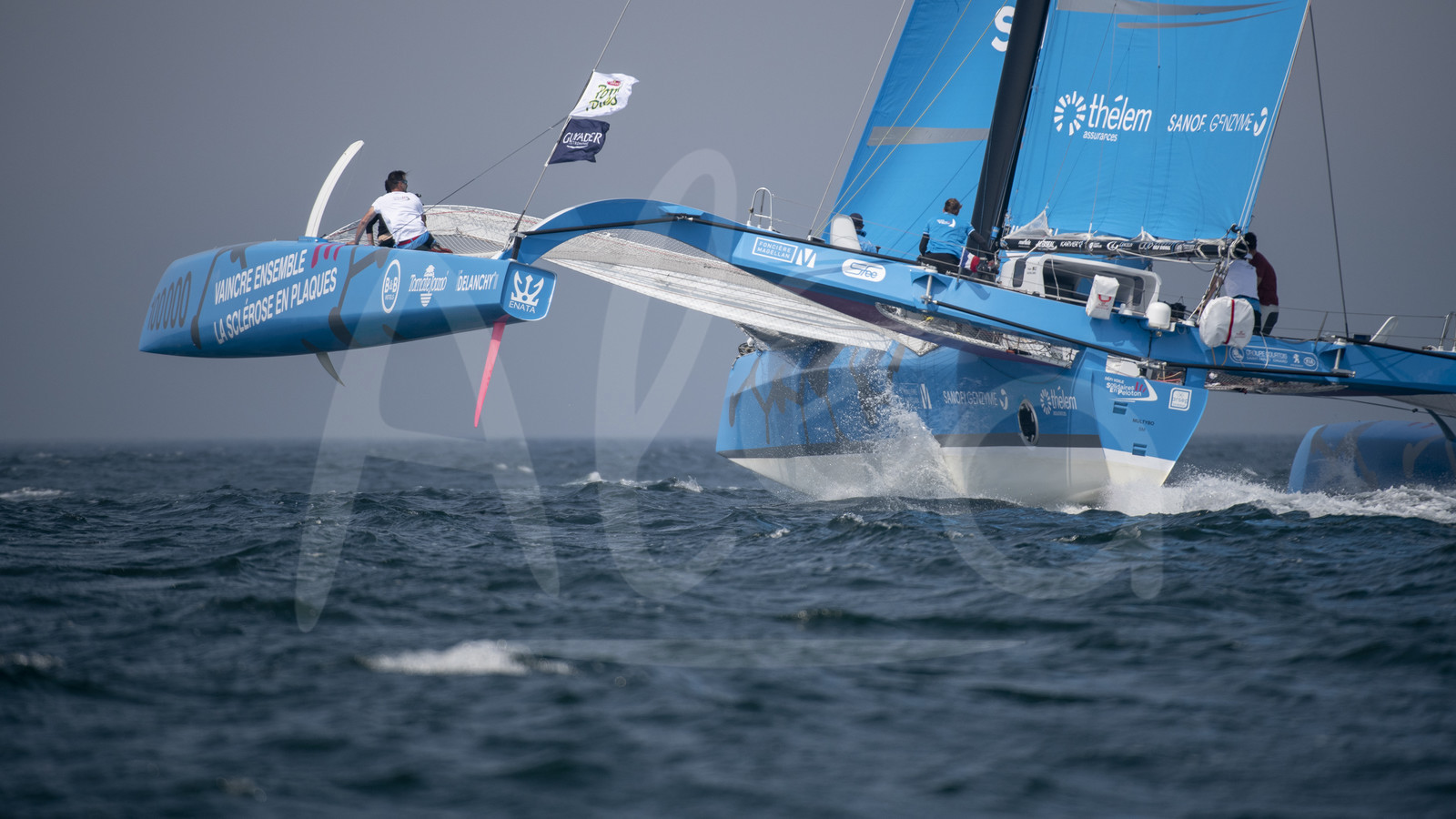 Description | Course des Multi 50 Solidaires en peloton Arsep, skipper Thibault Vauchel-Camus, durant le Grand Prix Guyader à Douarnenez, Bretagne, le 7 Mai 2018 - Photo Olivier Blanchet / Alea |