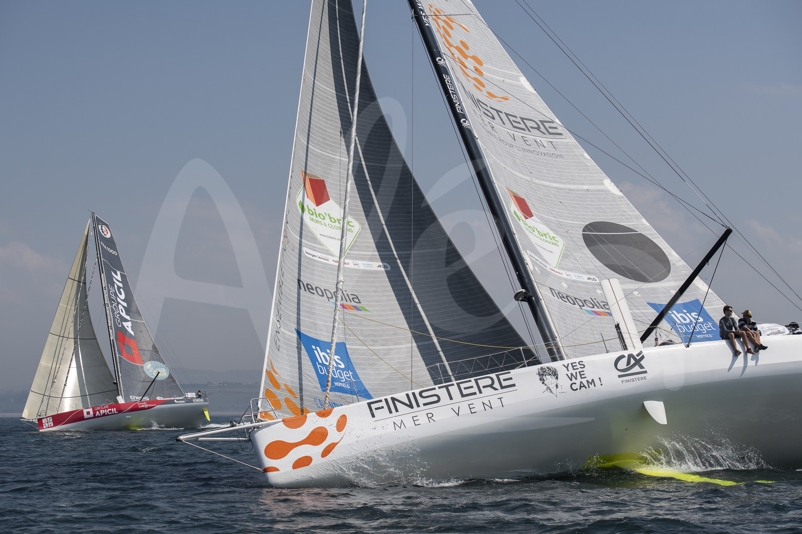 | Description | Skipper Jean Le Cam, Finistere Mer Vent, et Damien Seguin, Groupe APICIL, pendant le Trophée des voiliers de la classe IMOCA durant le Grand Prix Guyader à Douarnenez, Bretagne, le 7 Mai 2018 - Photo Olivier Blanchet / Alea |