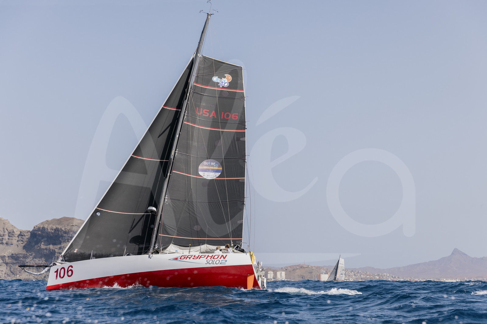 | Description | The Class40 GRYPHON SOLO II, skippers Joe Harris and Roger Junet (USA/ITA), is illustrated during start of the second leg of the Globe40 between Sao Vincente (Cape Verde) and Saint Louis (Mauritius), in Mindelo (Cape Verde), on July 17, 2022 - © Jean-Marie Liot / Alea |