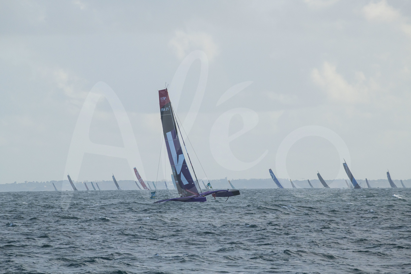 Description | SAINT-MALO, FRANCE - NOVEMBRE 9 : Ocean Fifty Koesio, skipper Erwan Le Roux, is illustrated during start of La Route du Rhum - Destination Guadeloupe 2022 on November 9, 2022, in Saint-Malo, France. (photo Vincent Curutchet / AleA) |