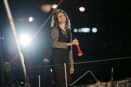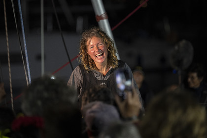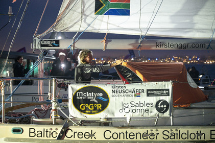 Arrivée de Kirsten Neushäfer, skipper sud-africaine vainqueur de la Golden Globe Race, course autour du monde en solitaire, sans assistance et sans électronique, le 27 avril 2023 aux Sables d'Olonne. Photos : Olivier Blanchet pour Alea