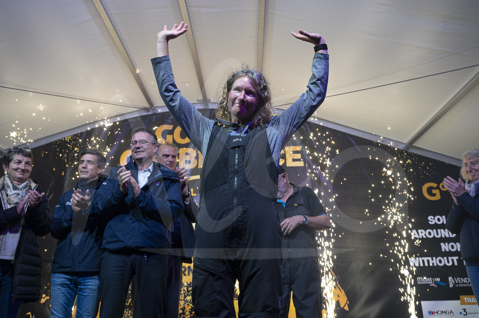 Description | LES SABLES D’OLONNE, FRANCE - APRIL 27: South African skipper Kirsten Neuschäfer celebrates on podium winning the round the world solo sailing race without any assistance, or electronics, on April 27, 2023 in Les Sables d’Olonne, France. (Photo by Olivier Blanchet/ALeA) |